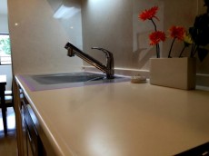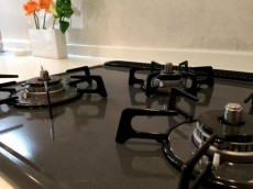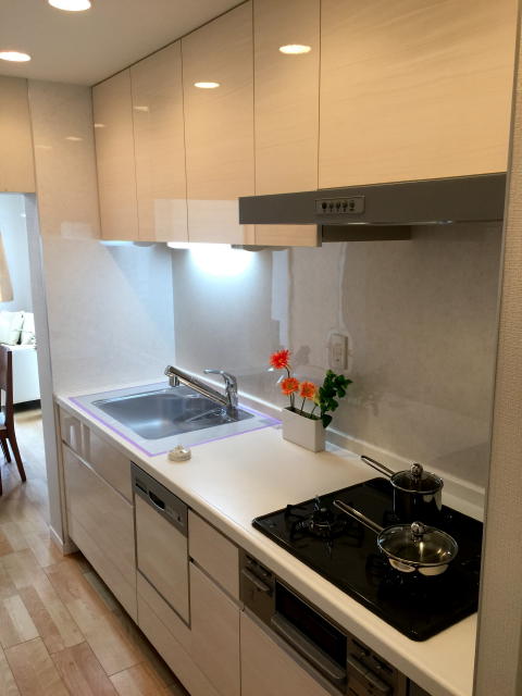 3つ口コンロはお料理好きの方には嬉しいですね♪人造大理石のワークトップ&シンクは大きめです(o´∀`ノ