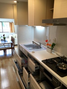 キッチンは上下に収納があり調理道具がたくさん入れられそうです♪シンク下のキャビネットは、スライド式で使い勝手◎