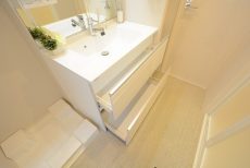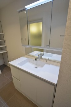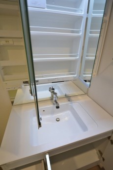 明るい三面鏡タイプの洗面台は収納豊富で、洗面用品やメイク用品など収納出来てとても快適に使用出来ます。