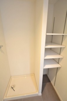 正面には洗濯機置場があります。洗濯用具がスッキリ収納できそうな奥行きのある棚も付いていました