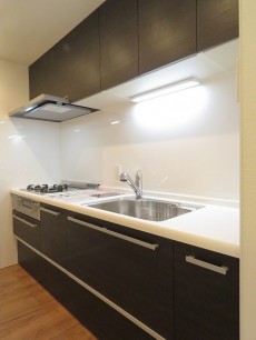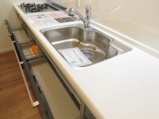 お料理がはかどる3口ガスコンロ、浄水機能付き水栓、人造大理石トップとキッチンはスペック◎。大割りのスライド収納も物の出し入れがしやすく使い勝手がよさそうです。