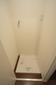 廊下に戻って、もう一つある白い扉を開けると、洗濯機置場があらわれました☆