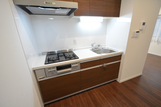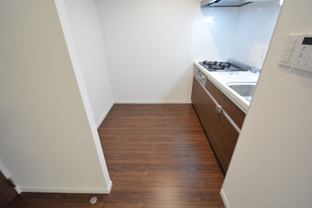 廊下の突き当りのドアを開けると、左側にキッチンがありました。かなり広いスペースをとっていますね!お料理がもっと楽しくなりそう♪