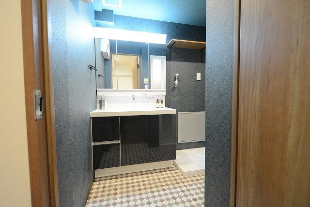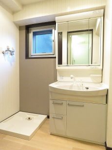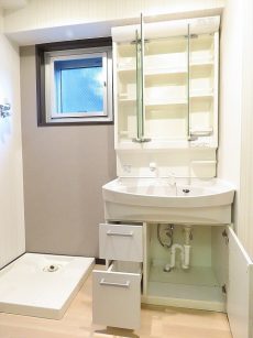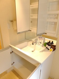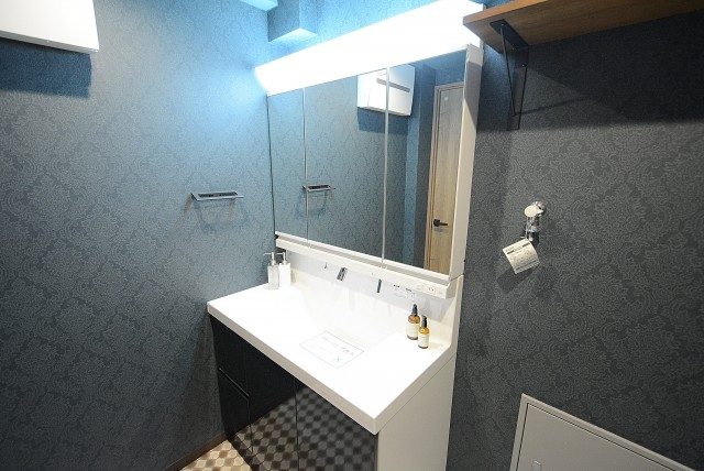 洗面化粧台は身だしなみを整えるのに便利な三面鏡付き。裏がキャビネットになっているので、洗面周りに散らかりがちな細々したものもスッキリと片付けることができますよ。