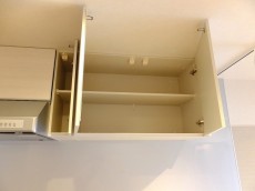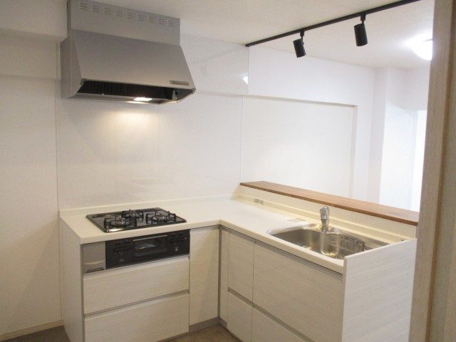 一番手前にキッチンがあります。とっても使いやすそうなL字型のキッチンは上部にも吊り棚があり、収納力も◎