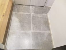 淡いグレーのタイル敷きが可愛らしい玄関。