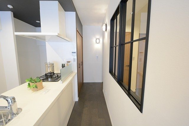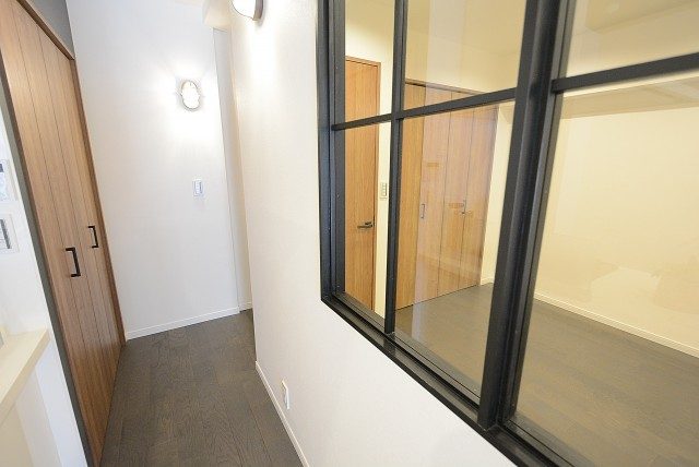 飾り窓がお洒落な廊下を通ってLDKへ・・・。