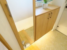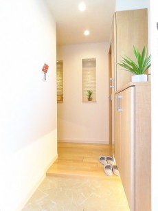 玄関横にはシューズBOXが設置されています。ファミリー分の靴だと少し収納スペースが足りないかもしれませんが、廊下にもたっぷり収納があるのでご安心を。