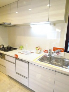 キッチンはホワイトの木目柄。お料理がはかどる3口ガスコンロ、浄水機能付き水栓、食洗機、収納たっぷりとスペック◎!お料理好きな奥様にもきっとご満足いただけるハズ。