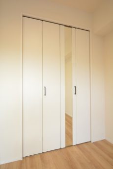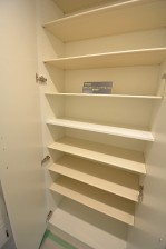 入って正面にトールサイズのシューズボックスがあります♪便利な可動棚なので、お持ちの靴の大きさに合わせて動かしてみて下さい☆扉には大きな姿見があるのでお出かけ前のチェックもバッチリです(o´∀`ノ