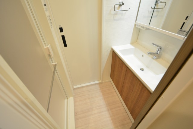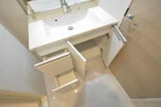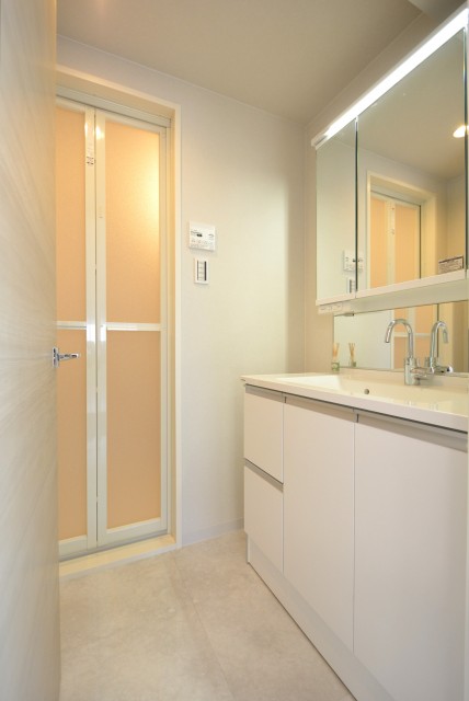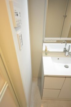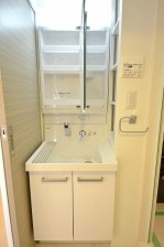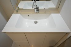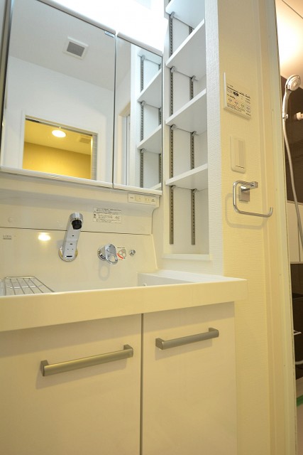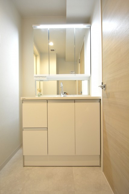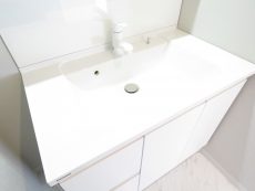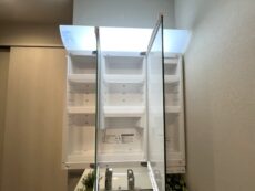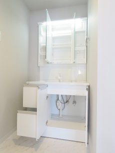 洗面化粧台は身だしなみを整えるのに便利な三面鏡付き。裏がキャビネットになっているので、洗面周りに散らかりがちな細々したものもスッキリと片付けることができます。