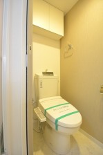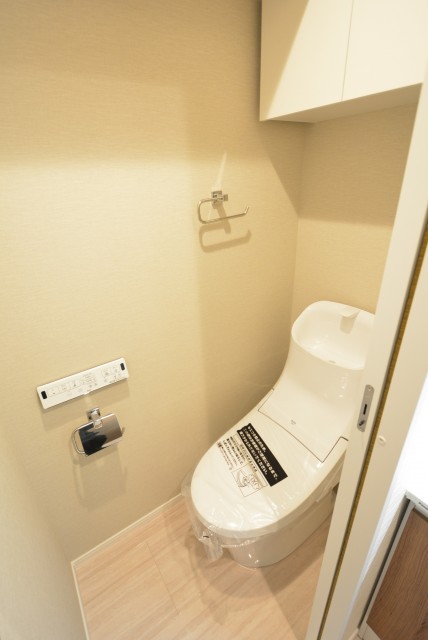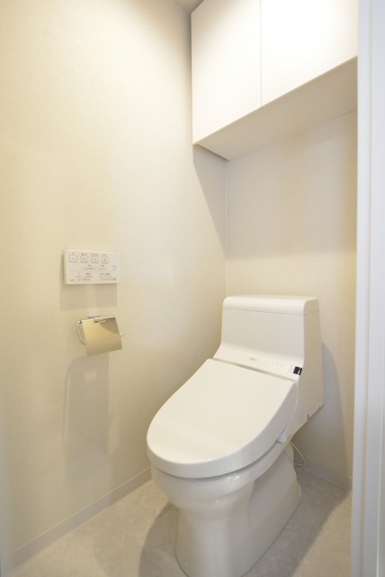 INAX製洗浄機能一体型。トイレットペーパーや掃除道具などの収納に便利な吊り戸棚も付いています。