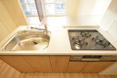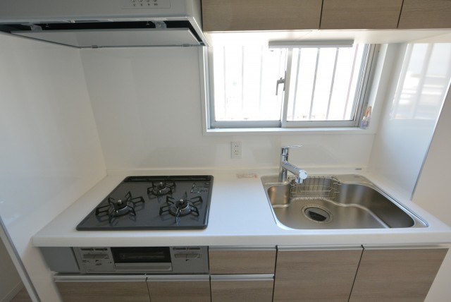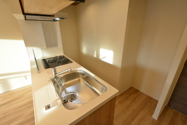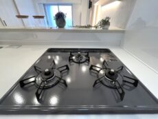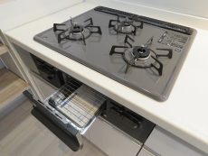 コンロは3口、グリル付き。シンクには、洗った食器などを置ける水切りスペースが確保されています。家事がスムーズに進みそう◎