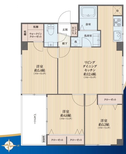 こちらは約12.8帖のLDKです。入口からキッチン、ダイニング、リビングと並んだオーソドックスなレイアウト。やわらかな色合いでまとめられた穏やかな印象のお部屋です。