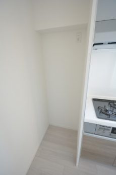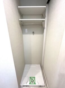 そして何気に広いです。後ろに棚があるので掃除道具やサニタリー用品はBOXなどを用意してこちらに収納すると良さそうです。