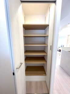 キッチンすぐ横の物入は、日用品はもちろん調理道具や食品ストックなどの収納にも便利そう◎