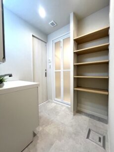 洗面室には洗面化粧台の他に、洗濯機スペース、リネン用の棚、浴室、トイレがひとまとめになっています。タオルや洗面関係ものなど、使うところに収納できるのは助かりますね。洗濯機スペースにも棚が付いているので、選択洗剤や洗濯ネットなどのランドリーグッズはこちらへどうぞ。