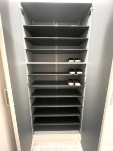 玄関内のシューズボックスは収納力のあるトールタイプ!◎棚の高さも調整可能なので高さのある靴の収納も問題ありません。