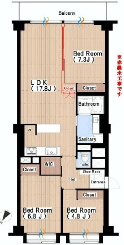 3LDKの表記ですが、現況は2LDKになっています。間仕切りを付けるか、このまま2LDKなのかはお客様次第です。もちろん間仕切りを入れる場合の費用は掛かりません。