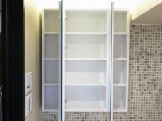 三面鏡の裏は収納トレイが取り付けてあるので、歯ブラシや洗顔フォームなどもスッキリと片づけておけます。