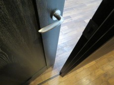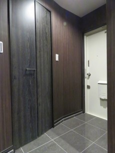 玄関をはいると廊下が左方向へのびています。フローリングは天然無垢のウォルナット材、建具や壁もウッド調で木の温もりが感じられるお部屋になっています。