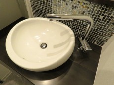 モザイクタイルとまあるい洗面ボウルが印象的な洗面化粧台。カウンターや鏡の横など物置スペースもあり使い勝手もよさそうです。