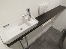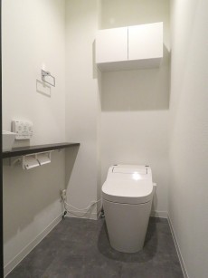 物入れのお隣がトイレ。ウォシュレットと手洗い場、吊戸棚がついています。