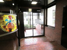 エントランス内はレンガ色っぽいタイル貼り。壁面の大きなステンドグラスが印象的です。お姫様でしょうか?
