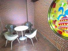 ステンドグラスの横はガラスの壁で囲まれており、イスとテーブルが置かれた応接スペースになっています。