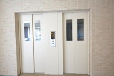 1Fの共用廊下を歩き、中頃にエレベーターが設けてあります。