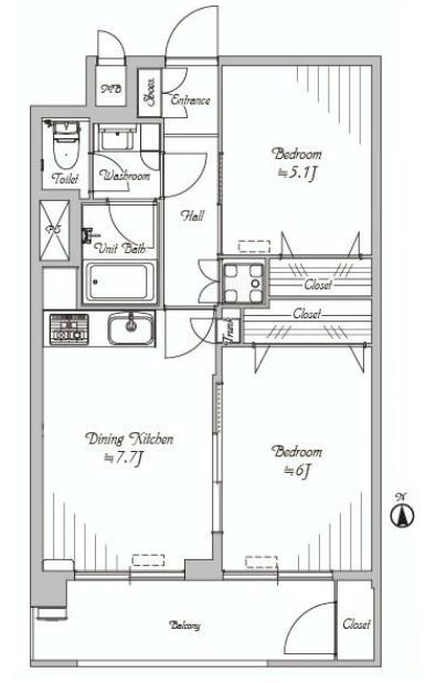 右手に洗面台・正面位トイレ、左手にバスルームの並びになっています。
