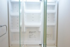 洗面化粧台は3面鏡の裏が一面収納になっており、ハブラシや洗顔フォームなどゴチャゴチャしがちな小物もスッキリ収納いただけます。