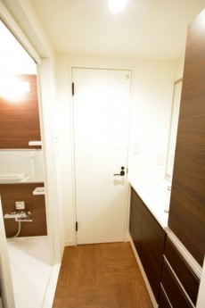 洗面室は扉をあけると正面に洗面化粧台、右側にバスルーム、左側にトイレの並びになっています。