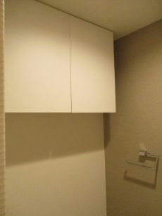 トイレ内には鏡付きの手洗い場と収納棚が設置されています。