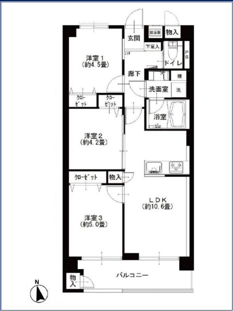 間取りのご紹介です。3LDK、専有面積は57.58㎡。