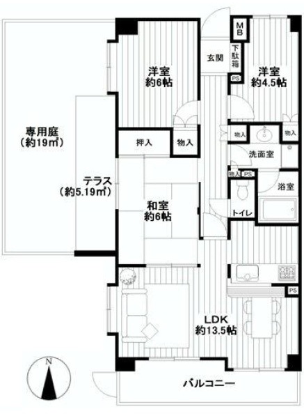 和室から約19㎡ある専用庭へ出られます。ガーデニングや家庭菜園も楽しめますね。小さなお子様がいるご家庭は遊び場としても使えそうです。