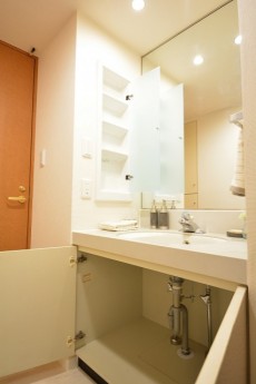 洗面台は横にキャビネットが設置されているので歯ブラシやコップ、洗顔フォームなどもスッキリ片付けておけます。