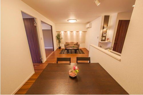 南東側のダイニングスペースからリビングダイニングキッチンを見ると、意外と(っていうのもなんですが・・・)広いでしょ!?