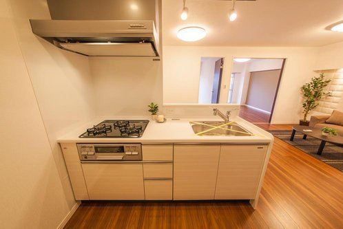 3口のグリル付きガスコンロ、浄水機能好きの水栓が付いています。
