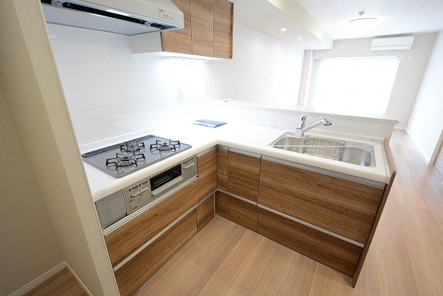 L字のオープンキッチンなので調理の動線も最小限で済みそうですね。角の部分がデッドスペースになりがちなので、家電を置いたりして工夫して使って下さいね。