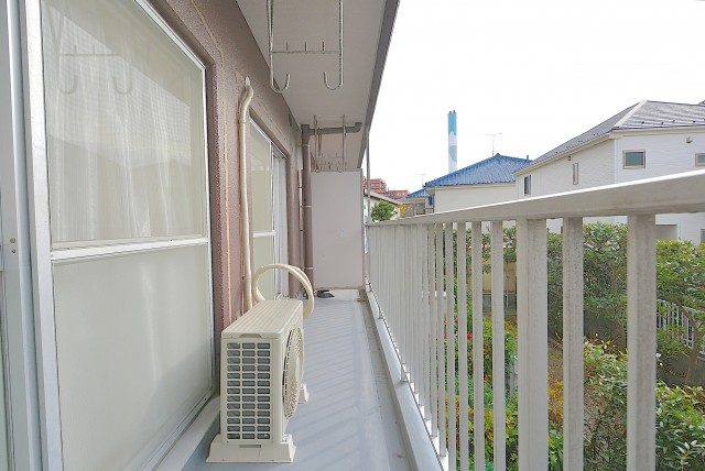 バルコニーはどちらの洋室からも出ることができます。お洗濯物は天井から吊るされた物干し台に干すので、行き来がしづらくなることはないと思いますよ!(^^)! 下に見える木々が癒してくれます☆