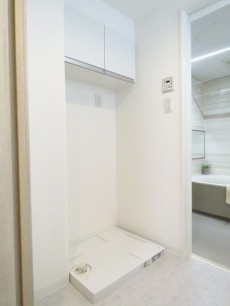 洗面台後ろには、収納棚と洗濯機スペースがありました。