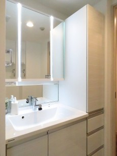 収納は洗面台下とミラーキャビネット。細かい物が多くなりがちな洗面周りには、キャビネットの様な収納が便利です。