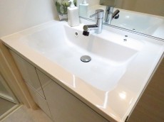 洗面化粧台は鏡の裏、横の棚、引き出しなど収納スペースが豊富。水回りで使うアイテムはまとめてこの中に納まるのではないでしょうか。