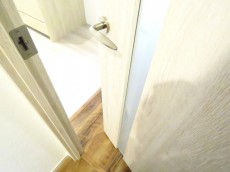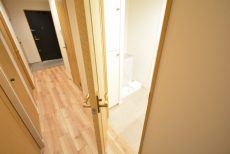真っ直ぐ伸びた廊下が、突き当りのドアまで続いていました。中間調のフローリングや建具を使用した、落ち着いた雰囲気の空間です。