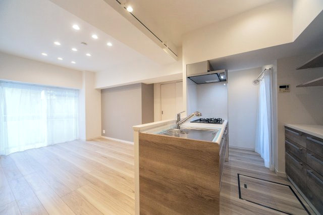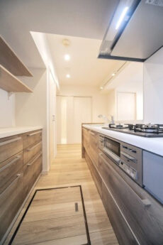 南向きバルコニーに面したお部屋です。キッチンの奥にもコンパクトなバルコニーへ出られるガラス戸があり採光通風ともにも良好!さすが角部屋ですね。縦長のお部屋にキッチン、ダイニング、リビングと並べるオーソドックスなタイプなので、家具のレイアウトに頭を悩ませることもなさそうです。