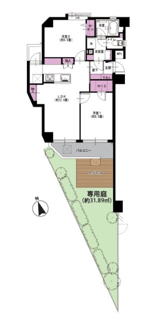 今回ご紹介するお部屋は1階、専有面積52.14㎡の2LDK。お一人暮らしからファミリーの方まで幅広くお使いいただけるお部屋です。戸建て感覚を味わえる専用庭付き!