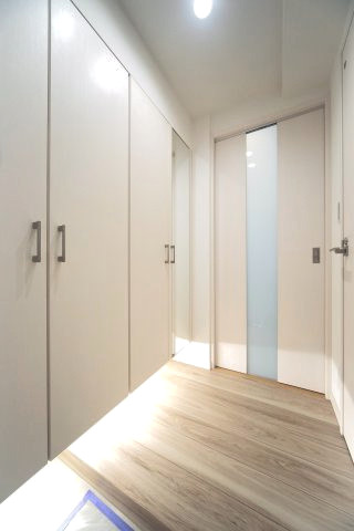 玄関から短めの廊下にかけてはずらりとシューズボックスが並んでいます。トールタイプが扉4枚分!これなら靴好きな方でも安心ですね。扉の一枚は姿見になっているので、お出かけ前に最終確認することもできますよ。