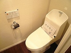 玄関右手にあるTOTO製ウォシュレット付トイレです。天井にピッタリと上部に吊戸棚が設置されています。高い位置にあるので窮屈さなど感じない空間です。