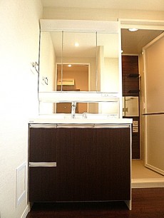 正面に洗面化粧台、バスルーム。バスルーム向かいに洗濯機置き場があります。